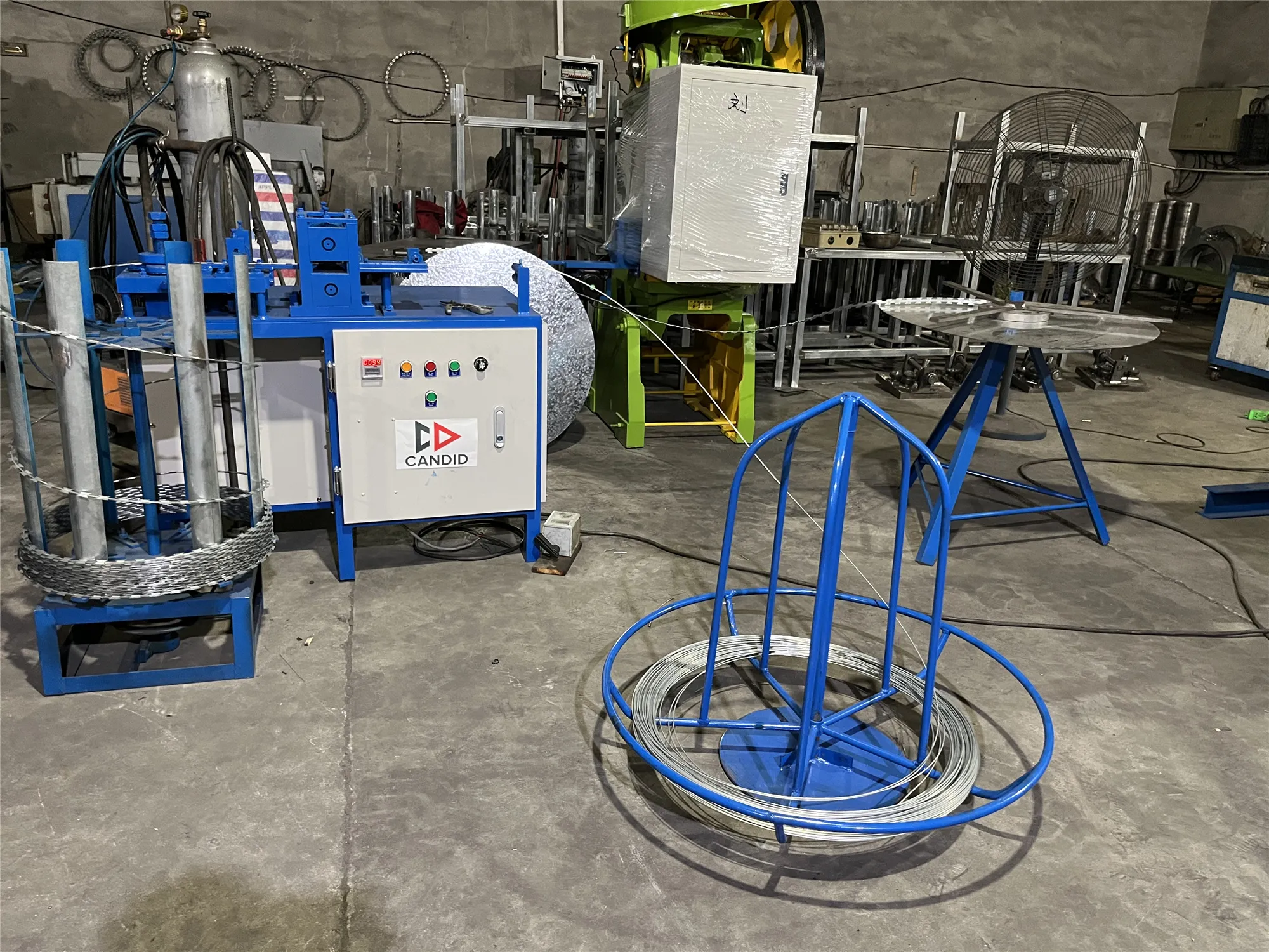 The razor(blade) barbed wire machine, also known as the razor barbed wire mesh machine, is a specialized machine for producing blade barbed wire. It consists of a feeding machine, a punching machine, a receiving machine, and a wire wrapping machine. Blade barbed wire is mainly used for security isolation in various places such as security fencing in military, prison, airport, and industrial applications, offering a formidable barrier against unauthorized access, residential areas, schools, factories, and farms.